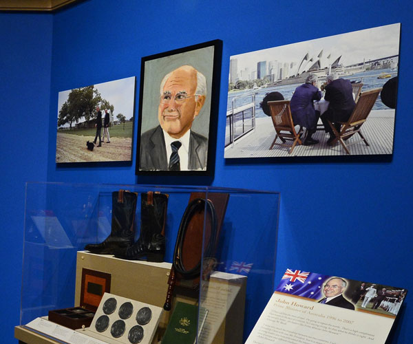 A section of the exhibition featuring a painting and photograph of former Australian Prime Minister John Howard.