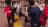 Dressed in yellow, she is directly in the path of the guard, who shoves her almost to the ground from behind. The woman screams and looks shocked, while the red-clad guard continues his drill.