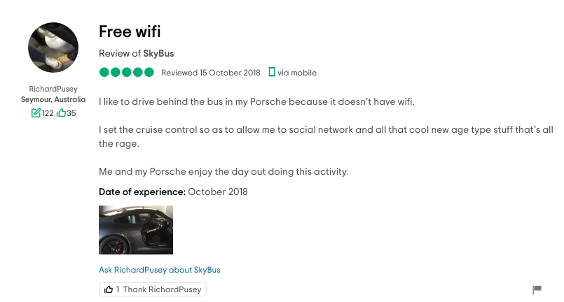 Mr Pusey, who says on social media he is from Seymour, in central Victoria, has left hundreds of TripAdvisor reviews. In some, he boasts about “racing” his Porsche.