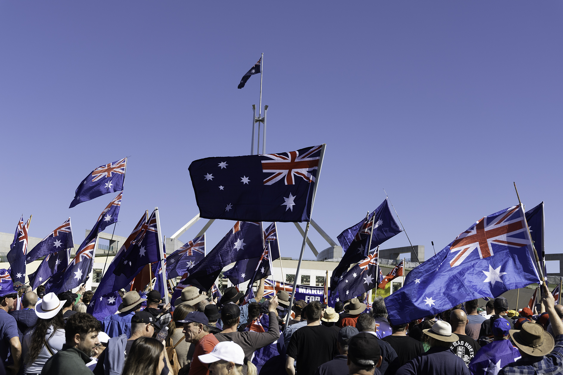 Anti-Immigration Rally on the front lawns of Parliament House after marching from Regatta Point in Canberra today. Sunday 31st August 2025 Photograph by Mike Bowers.