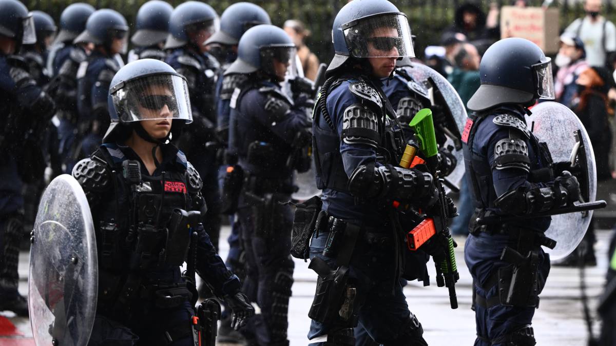 Victoria Police gather on Spring Street during the March for Australia anti-immigration rally in Melbourne
