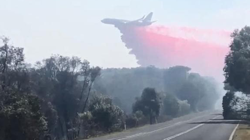 Videos posted to social media by the RFS show large air tankers dropping thousands of litres of fire retardant close to homes to slow the fire.