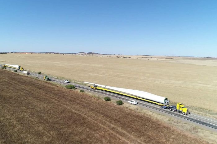 Two of the 65-metre blades were towed from Port Adelaide in South Australia to Silverton, near Broken Hill, over the course of about 12 hours on Wednesday.