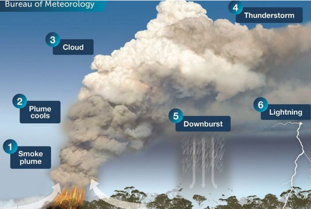 Further south in the Bega Valley, there is a cluster of fires which are generating pyro-convective columns with lightning.