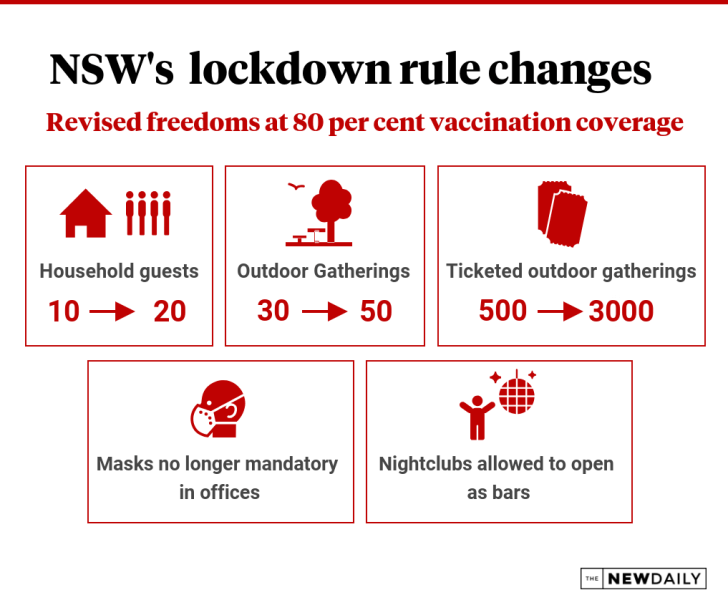 The freedoms due to come into play on the Monday after NSW hits 80 per cent double-dose vaccine coverage in late October have also been expanded.