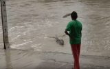 The woman and her dog stood undeterred at the water’s edge as a croc stalked them from the shallows, while horrified onlookers watched from above.