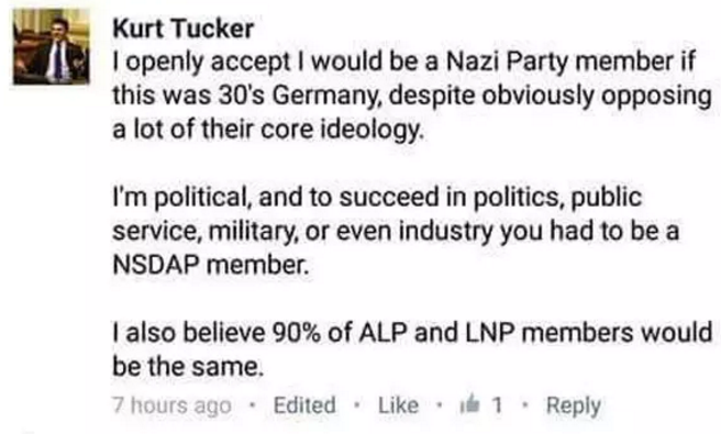 “Following his comments on Facebook that have since been reported to the media, Kurt Tucker has resigned as President of the UG Liberal National Club and from Young LNP Management Committee,” it read.