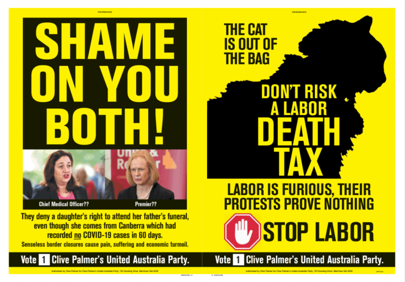 “The cat is out of the bag,” screamed the Palmer ad placed in the final days of the campaign. “Don’t risk a Labor death tax. Labor is furious, their protests prove nothing.”