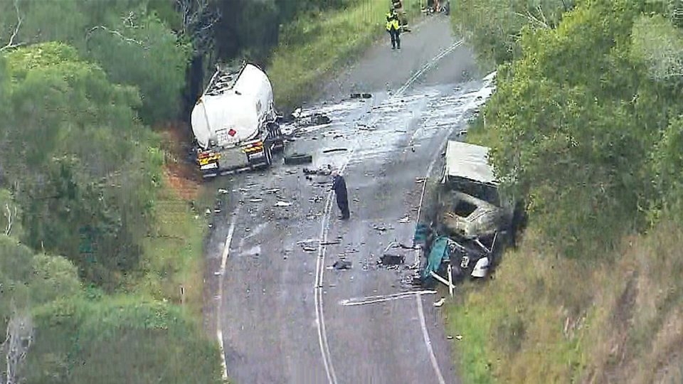 Emergency services rush to the D’Aguilar Highway at Nukku before 6am on Thursday after reports the tanker and a heavy rigid transport truck were involved in a head-on smash.