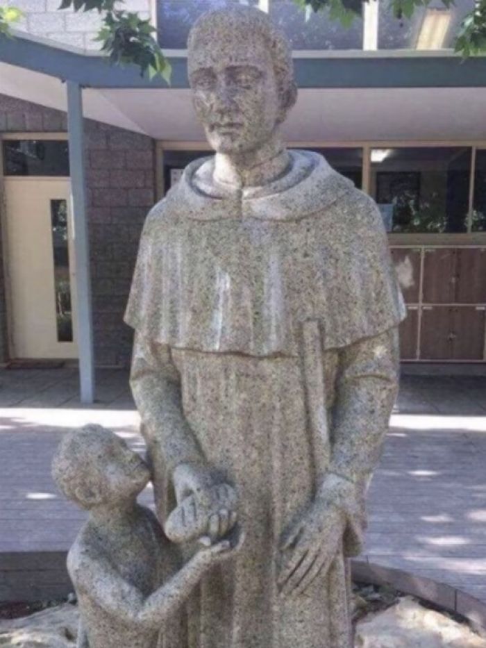 The statue was recently installed at Blackfriars Priory School in Prospect and depicts a 16th century saint handing a bread loaf to a child’s outstretched hand.