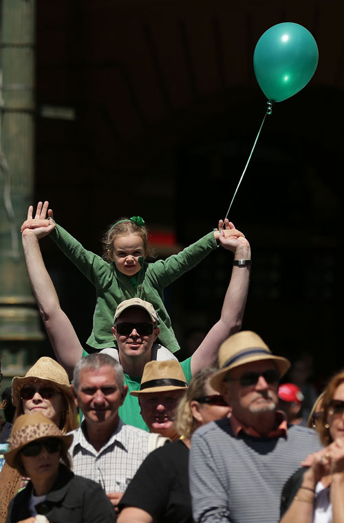 Crowded along the parade route, onlookers saluted in unison to block the sun while catching a glimpse of the riders and trainers vying for Cup glory on Tuesday afternoon.