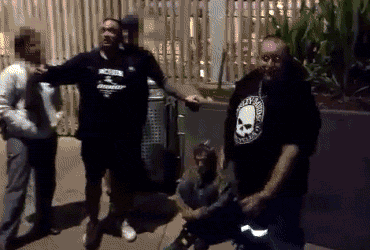 As the three men talked, one of the harassers, his hair shaved into a mohawk, with tattoos on his forearms and neck, a gold chain around his neck and wearing a Harley Davidson t-shirt, noticed he was being filmed. The situation quickly turned violent.