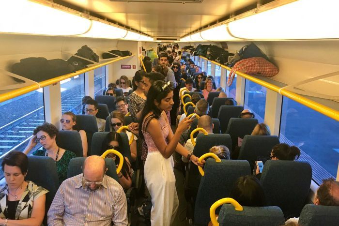 Stephanie Wisely stands on an overcrowded morning peak train service from Geelong to Melbourne.