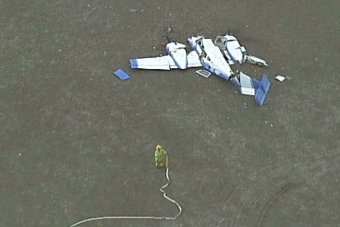 Aerial footage of the scene appears to show the wreckage of one light plane in a clearing, and the wreckage of a second in bushland nearby.