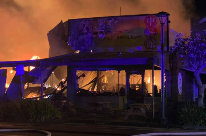 Photos from the scene show the town’s Chinese restaurant and fish and chip shop on fire, with reports the neighbouring hardware store was also impacted.