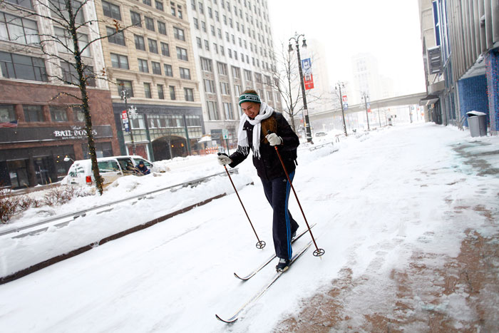DETROIT, MI: A woman skis to work through several inches of snow.