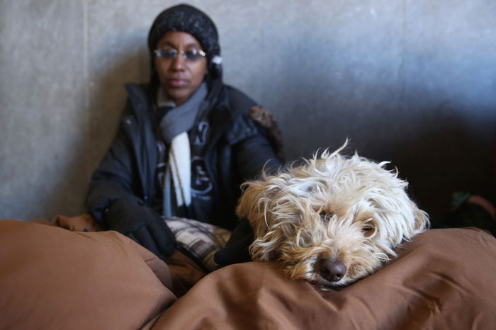 WASHINGTON, DC: Lasharn Harvey protects herself and her dog Sahara from the cold underneath a large sleeping bag.