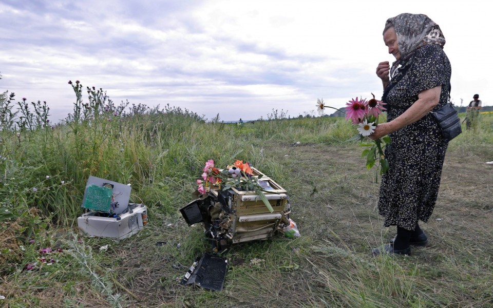 An elderly Ukrainian lays flowers on debris at the crash site.
