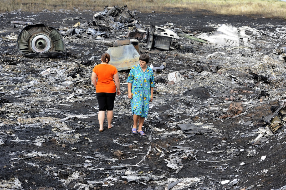 Local residents stand among the wreckage at the site of the crash of a Malaysia Airlines plane carrying 298 people from Amsterdam to Kuala Lumpur in Grabove, in rebel-held east Ukraine.