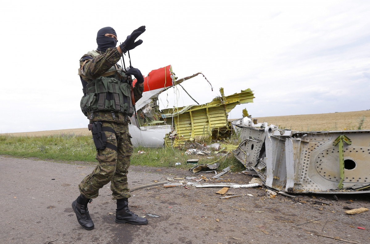 A pro-Russian fighter guards the crash site of a Malaysia Airlines jet near the village of Hrabove, eastern Ukraine.