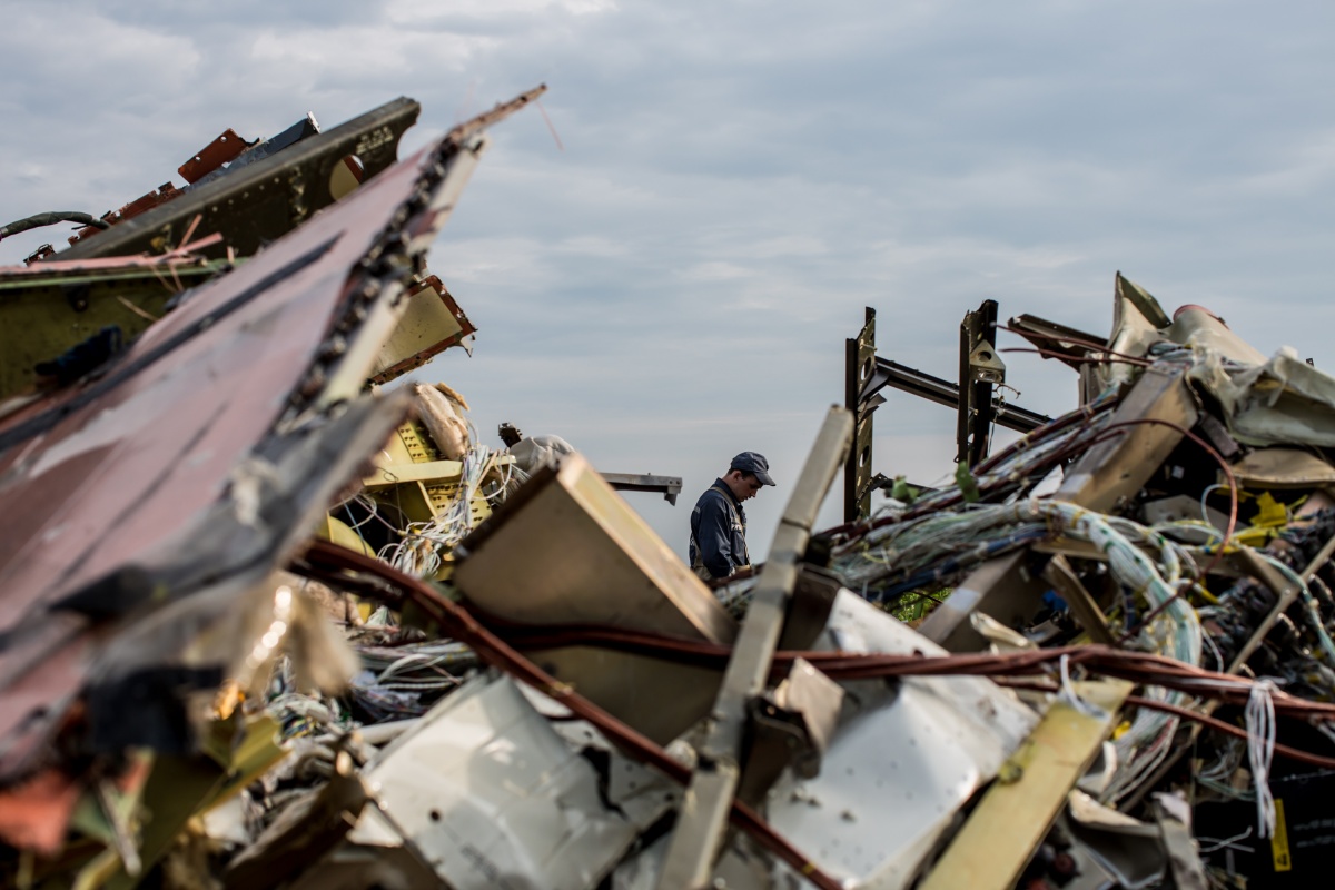 People look at debris from Malaysia Airlines flight MH 17 which landed in a field of sunflowers on July 19, 2014 in Rassipnoye, Ukraine.