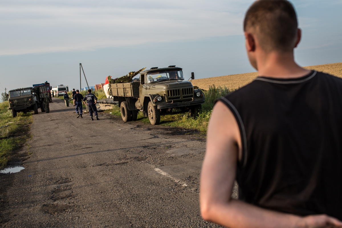 A man blocks access to the scene of the crash of Malaysia Airlines flight MH 17 as emergency personnel remove the bodies of passengers after pro-Russia separatist fighters established control of the site.