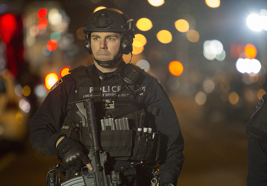 The Post said the officers were shot as they wore their uniforms and sat in their marked police car while working overtime as part of an anti-terrorism drill.