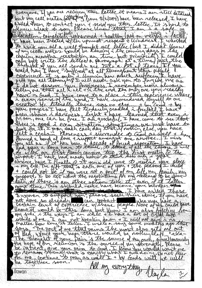 In a note written to her family during her 18-month captivity, Ms Mueller said she was being treated with the “utmost respect and kindness” by her captors, and had learned to look for the good in every situation.