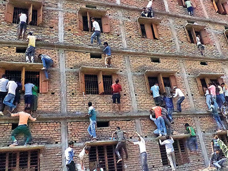 The images, first published by the Hindustan Times, showed dozens of men climbing the walls of a test centre, perching on window ledges and handing answers to students inside.