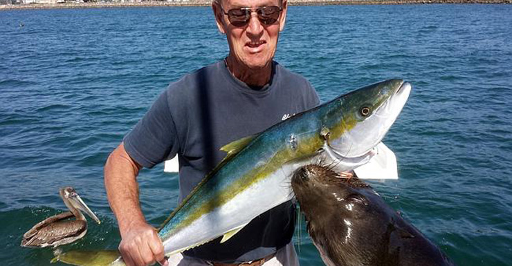 Californian resident Dan Carlin, 62, has been plucked out his boat by a sea lion while proudly posing for a photo with a recent catch.