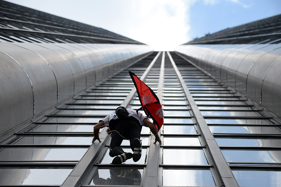 ‘Spiderman’ aka French urban climber Alain Robert scaling a 210m skyscraper in Montparnasse with the Nepalese flag as a tribute to the earthquake victims.