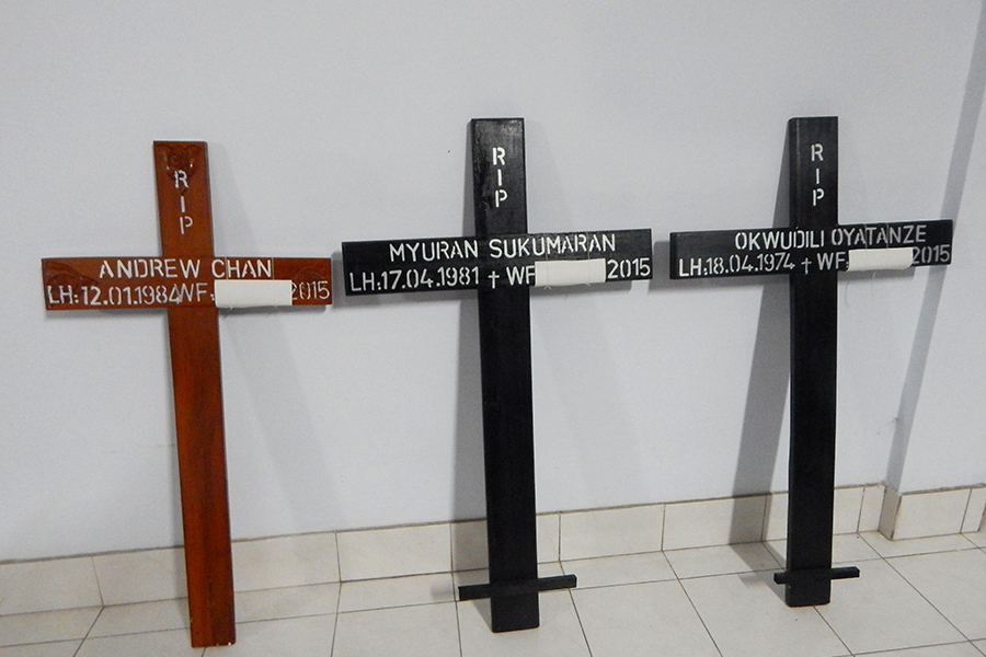 Crosses for Australians Andrew Chan and Myuran Sukumaran, and Nigerian Okwudili Oyatanze are lined up ahead of their executions in Indonesia.