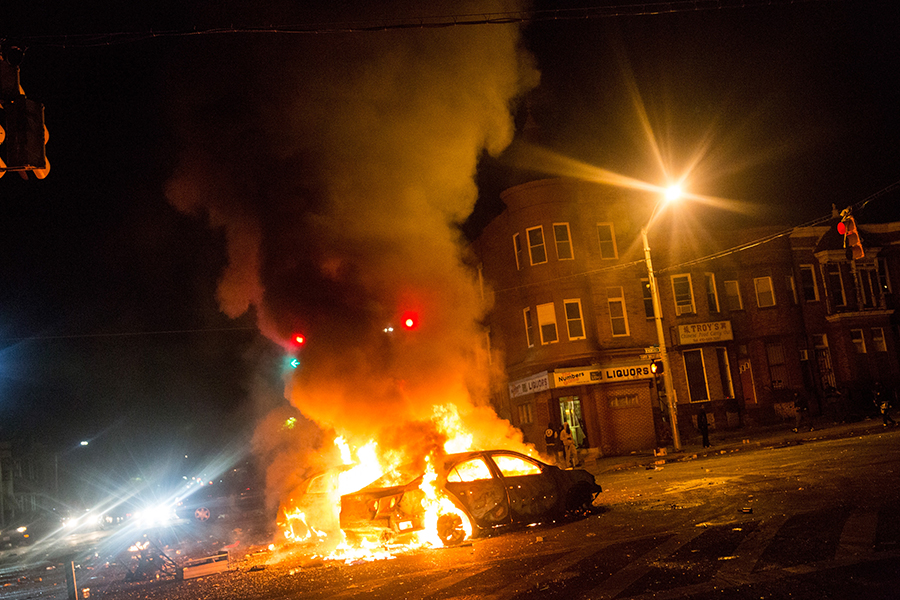 Cars and buildings were set alight by rioters and looters in Baltimore detracting from initially peaceful protests.