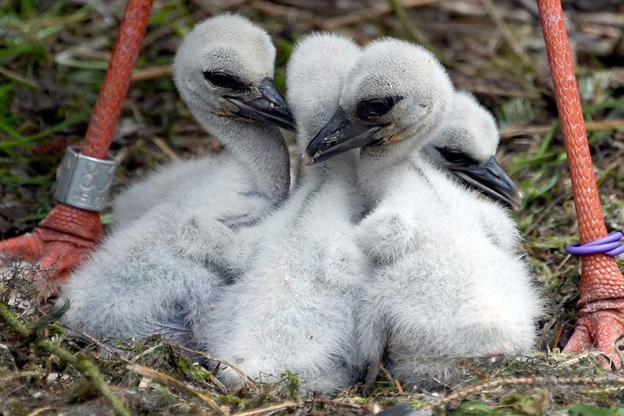 Stork chicks sit in their nest at the Wildpark Eekholt deer park near Grossenaspe, Germany.