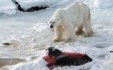 In the photos a visibly skinny old male bear devours one of the dolphins and appeared to have stored a second one under snow for later – something which scientist had never seen before.