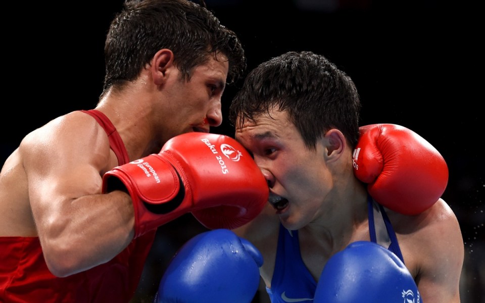 Bator Sagaluev representing Russia takes a punch from Muhammed Unlu from Turkey in the Men's Boxing Semi Final at the Baku 2015 European Games.