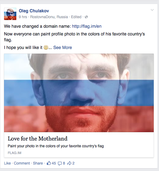 After seeing the popularity of the rainbow filter, Russian graphic designer Oleg Chulakov created a Photoshop tool to add the colours of the Russian flag to users’ pictures.