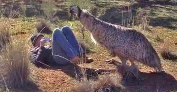 A US tourist made the foolish decision to lie down in front of Australia’s mightiest bird.
