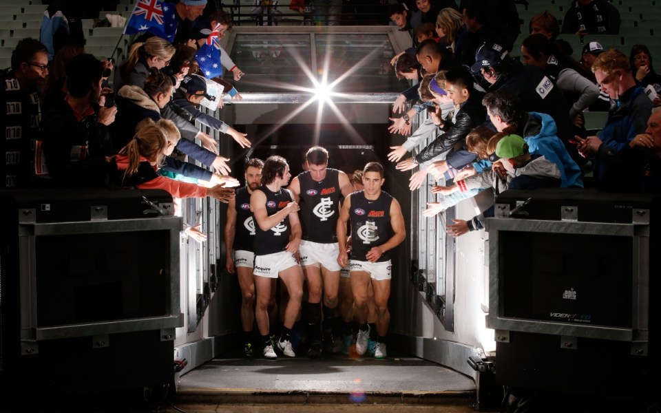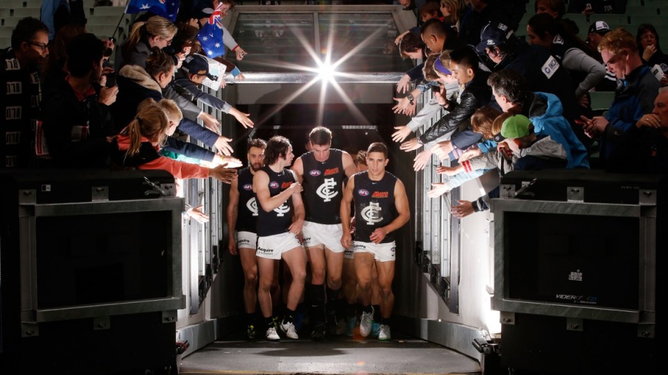 Carlton players walk up the race after the half time break during the round 19 AFL match between the Collingwood Magpies and Carlton Blues at the Melbourne Cricket Ground.
