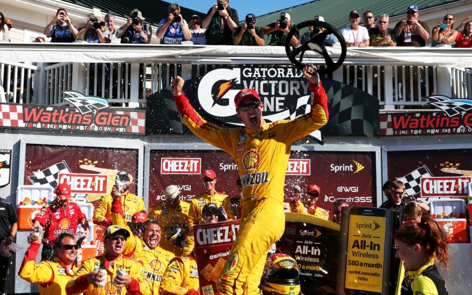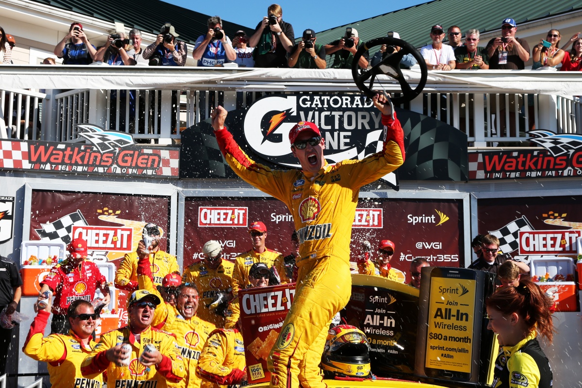 Joey Logano, driver of the #22 Shell Pennzoil Ford, celebrates in victory lane after winning the NASCAR Sprint Cup Series Cheez-It 355 in Watkins Glen, New York.