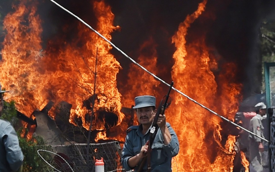 An Afghan policeman stands guard as smoke and flames rise from the site of a huge blast struck near the entrance of Kabul's international airport.