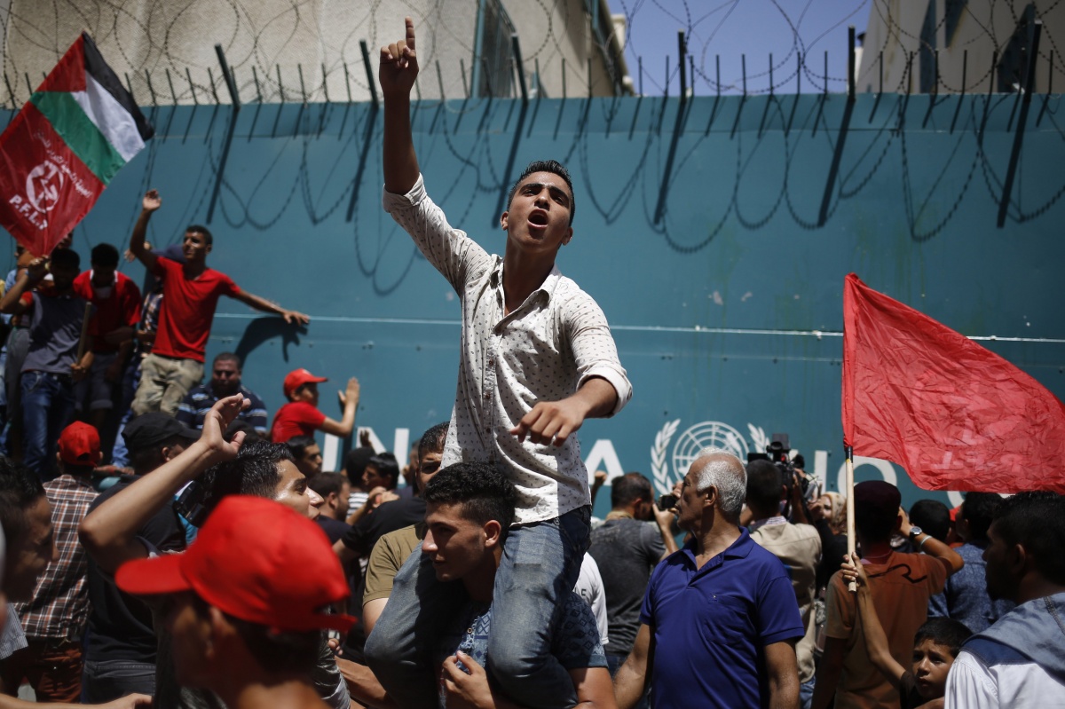 Palestinians take part in a protest against the reduction of educational programs provided by the United Nations Relief and Works Agency outside the UNRWA headquarters in Gaza City.