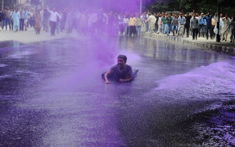 Kashmiri government employees shout slogans as purple-dyed water is sprayed by security personnel during a protest in Srinagar.