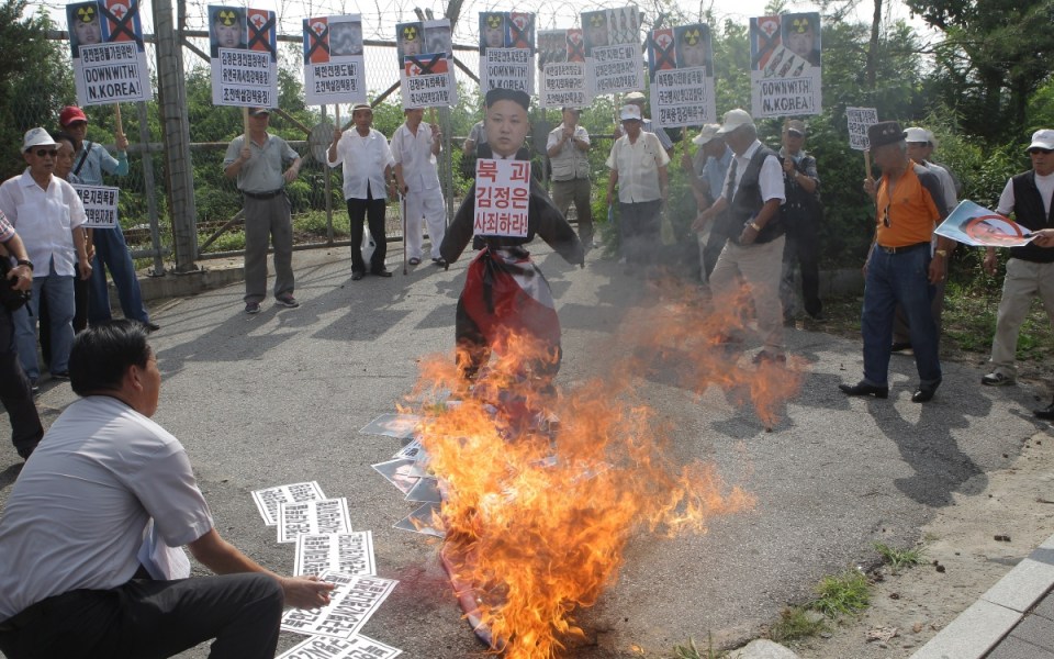 South Korean conservative protesters burn a effigy of North Korea leader Kim Jong-Un and that country's flag during a protest rally near the demilitarised zone at Imjingak in Paju, South Korea.
