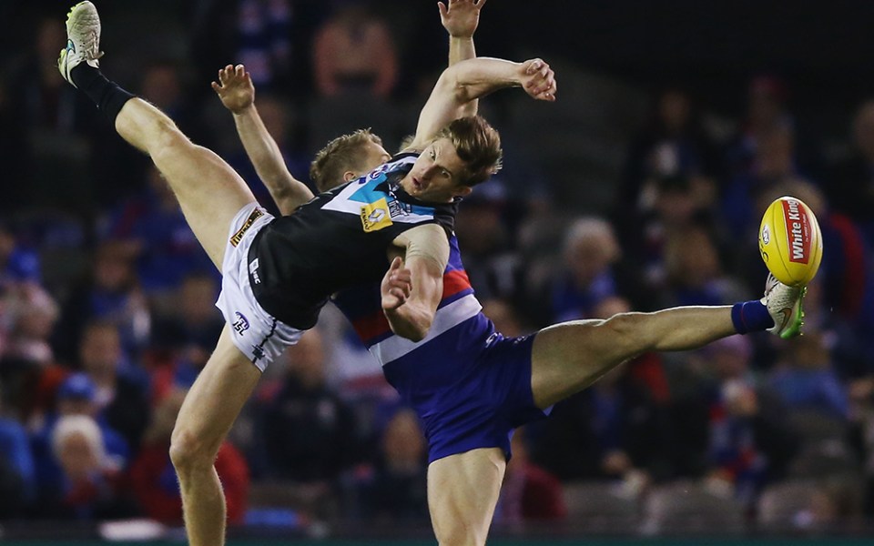 Two players dance around the ball during an AFL match between Port Adelaide and the Western Bulldogs.