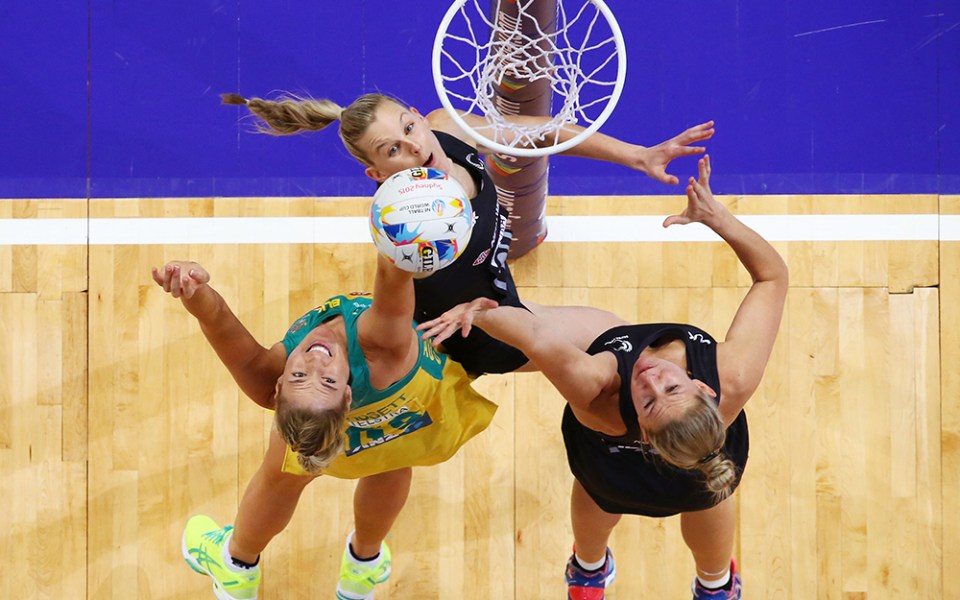 Australian and New Zealand netball players compete for the ball during the Netball World Cup in Sydney.
