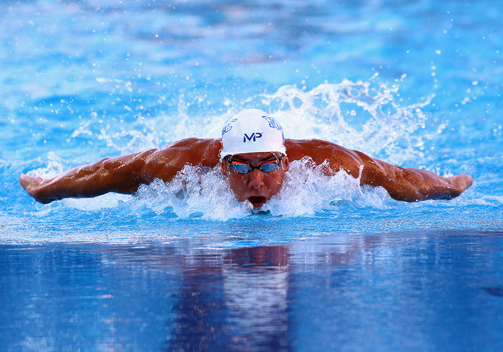Michael Phelps flexes his muscles in the Men's 200 Meter IM final at a competition in Texas.