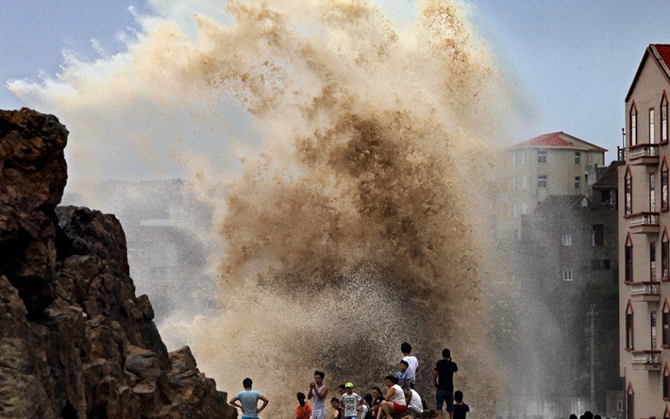 People gather to watch the waves stirred up by Typhoon Soudelor in eastern China.