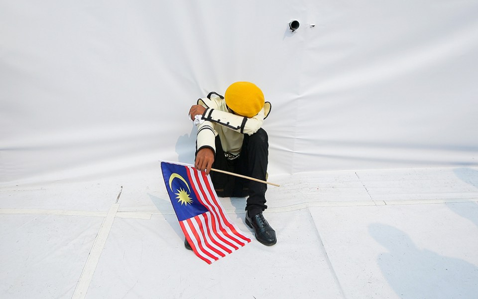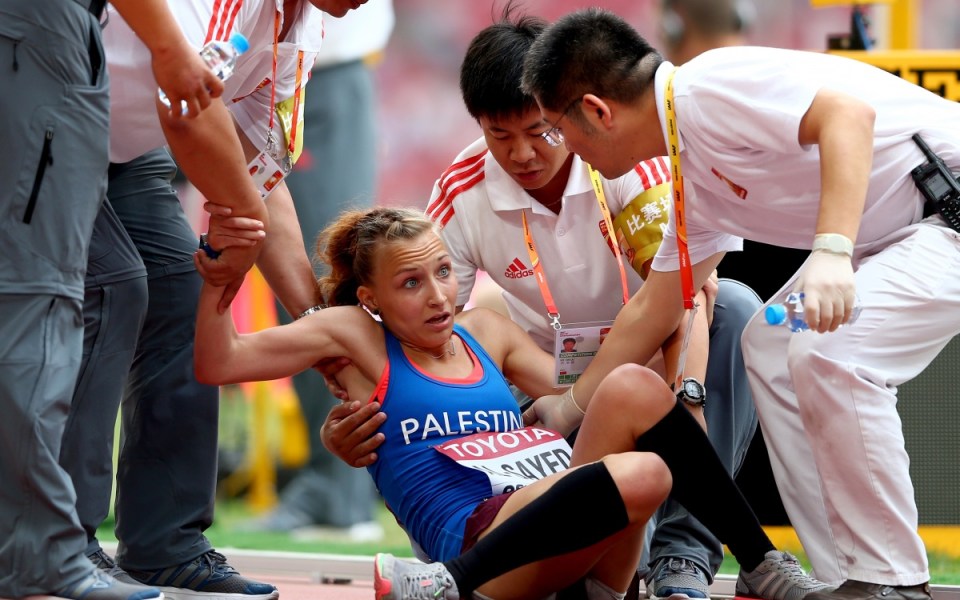 Mayada Al Sayed of Palestine collapses with exhaustion after crossing the finish line in the Women's Marathon final of the 15th IAAF World Athletics Championships at Beijing National Stadium in China.