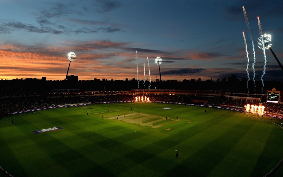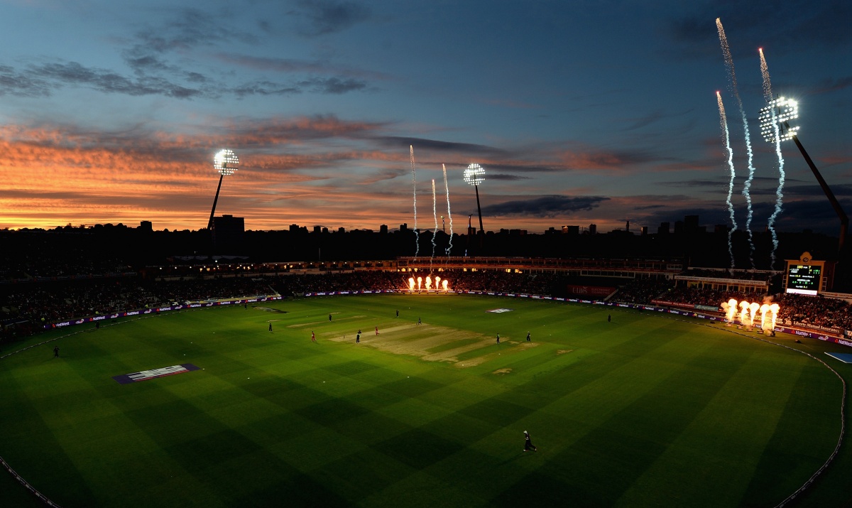 The sun sets during the NatWest T20 Blast cricket final between Lancashire Lighting and Northamptonshire Steelbacks at Edgbaston in Birmingham, England.
